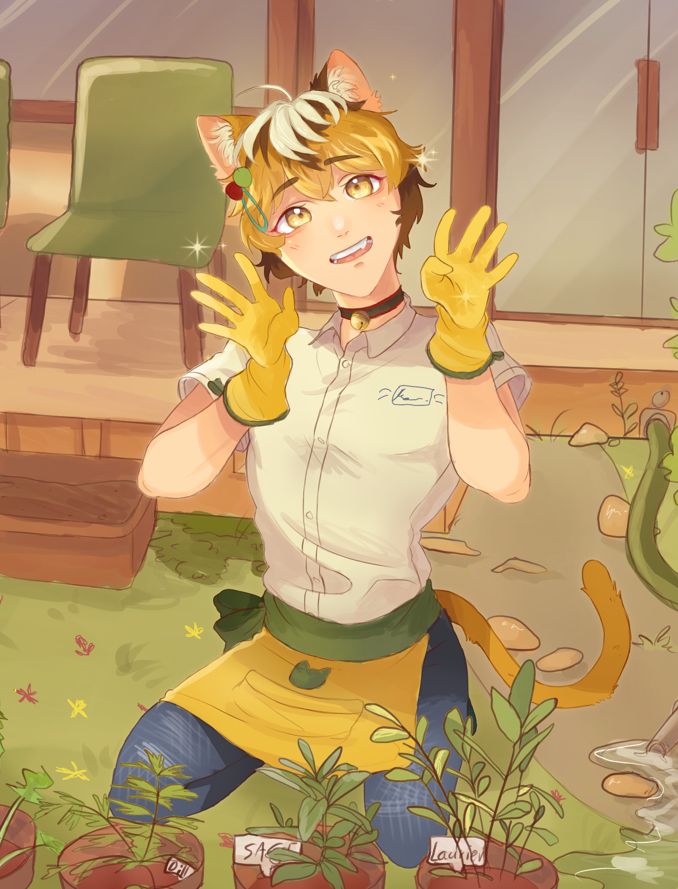 I started a series of the catboys all gardening like literally years and years ago at this point, but only ever drew Fennel until now... So I finally decided to try and make the next piece in the series...! Dill gardening looks so cute, but I doubt he'd like really getting his hands dirty since he cares for his appearance, hence the little gloves. :3