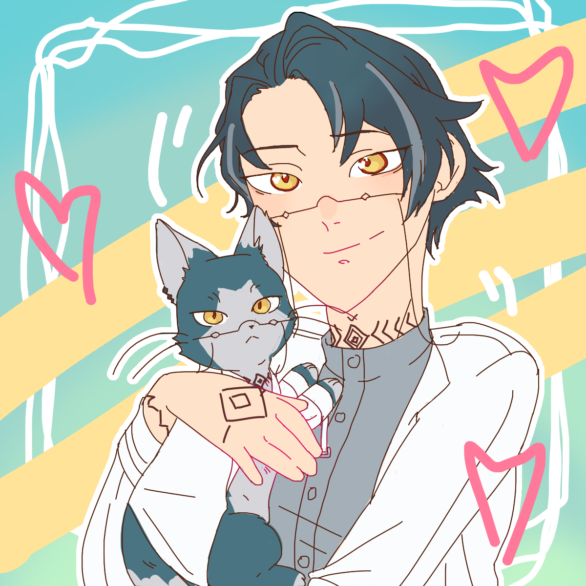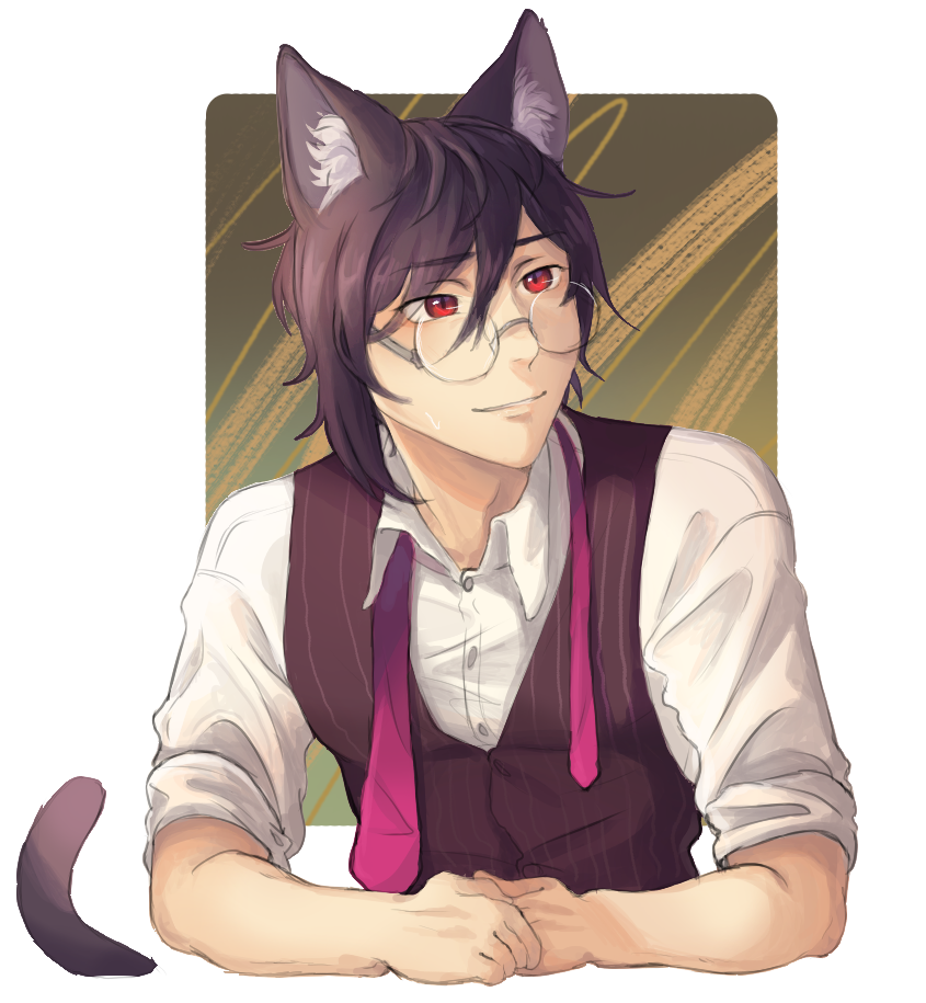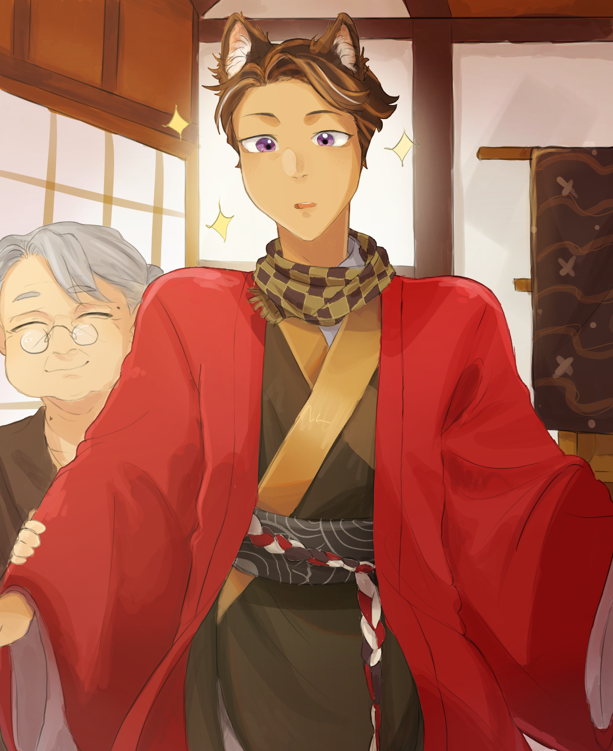 I realized I had done a stand-alone piece for all of the catboys at this point except Sage...! And since that made me really sad, I decided to change that finally! I remember him telling the player that an older lady made his kimono for him after he helped her (at least, if I remember correctly) and I thought that mental image was very sweet, so I drew my idea of it!!